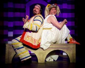 Of course, this is a farce. And so, numerous complications crop up. For instance, a vain Roman soldier has already purchased Philia to be his bride. Even old man Senex (a wide-eyed, playful Troy Stanley) has his sights set on Philia. At one point, there are even three Philias. Specifically, there’s the real one, a wig-sporting slave suitably named Hysterium (Michael Scott Ross, full of nervous energy) and a wig-bearing Domina (a melodramatic and commanding Aaron Bower). Amid all this, it will be up to Pseudolus to use his craftiness to secure the real Philia for Hero and keep the other men who desire her away.