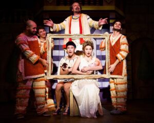 Director Jonathan Van Dyke paces the production at a speed befitting a farce. At the same time, he allows us to follow the complex plot without feeling lost. Further, the director emphasizes playfulness and physicality. And he ensures that the performers master the legendary Sondheim’s often tongue-twisting, yet smartly-rhyming, creative lyrics.