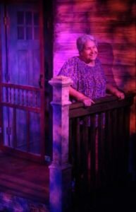 Tender moments exist between the characters, thanks to the strong chemistry that the actors share with each other. And Ledford, as the director, gives such moments the emphasis they need. In addition to deftly pacing the production, Ledford’s staging is smart. For instance, at one point, she positions Corey so that Calista’s back faces her brother while they are talking. This clearly communicates to us that the siblings are not on friendly terms. To her credit, Ledford gives equal weight to the dark and comical portions of the play.