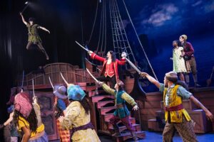 Meanwhile, on the ground and opposite Almeida, Cody Garcia lends Captain Hook a commanding aura and menace. But the actor, with long, dark hair, dark eyes, and flashing a cunning smile, also endows Hook with a flamboyance. This quality helps to ensure that Hook comes across as not only mean and fearsome, but comical, and somehow lovable. Garcia’s Captain Hook basks in the limelight during “Hook’s Waltz,” the familiar song that celebrates the villain.