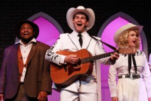Hank Williams (Andy Christopher, center) happily plays and sings. Flanking him are Chaz Rose (left) as Tee-Tot and Lindsey Corey as Audrey Williams.
