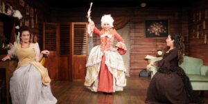 Zoë Darragh Garnett as Olympe de Gouges, Elizabeth Chavez as Marie Antoinette, and Dayana Morales as Charlotte Corday in Main Street Players’ production of “The Revolutionists” at the Main Street Playhouse, Miami Lakes.