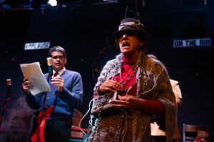 The cast performs on a realistic set depicting WNCP with detail. For instance, there are microphones and multiple signs indicating that we are at a radio station. They include one sign that reads “On the Air,” while another sign reads “Applause.” The latter lights up to encourage the live audience to put their hands together at appropriate moments. In addition, colored lights appear against dark walls. The contrast could be symbolic, suggesting that even amid darkness, there is light.