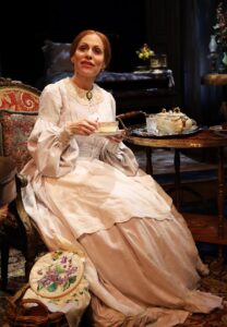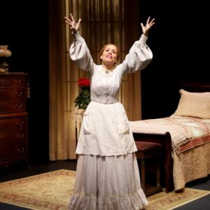 We, the audience, are adult visitors to her Amherst, Mass. home. It is 1883, three years before the poet’s death at 56. Scenic designer Michael Amico has designed with detail a spacious, homey, and inviting residence. It features bright, multicolored rugs, brown furniture, red roses, and family photos. Also, the set includes period details. They include ink for a fountain pen and period lamps. Dickinson, sporting an appealing full-length white period dress with an apron over it (Brian O’Keefe designed the period costume) warmly invites us into her world.